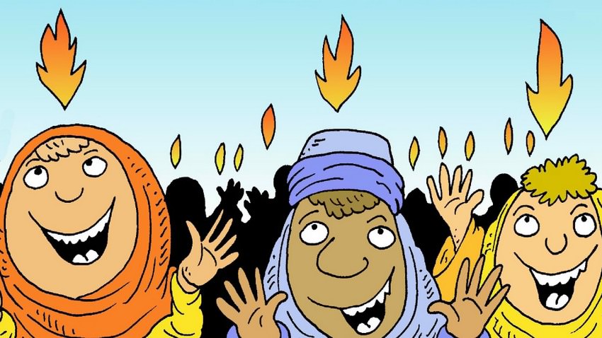The disciples went back to Jerusalem as Jesus had told them to do. A while later, the disciples were in a house waiting to celebrate Pentecost (the Jewish harvest festival). Suddenly there was a sound like a strong blowing wind in the house. They saw things like flames of fire that came and rested on each of the disciples. They were filled with the Holy Spirit, the helper just as Jesus had promised.