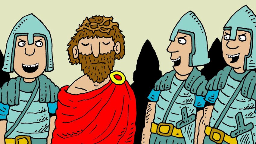 Pilate asked them, "Why? What crime has he committed?" But, they shouted even louder, "CRUCIFY HIM!! CRUCIFY HIM!!" When Pilate saw that he was getting nowhere, he took some water and washed his hands in front of the crowd. (This is where we get the phrase 'washing our hands of something' when we want to show that we don't want the blame if something goes wrong!) Then Pilate released Barabbas. Jesus was flogged, and handed him over to be crucified.