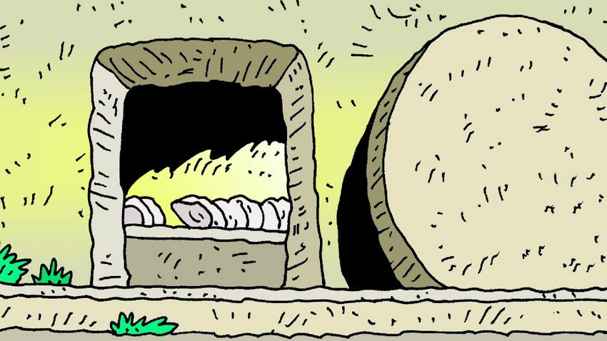 Early on Sunday morning, Mary Magdalene, one of Jesus's followers, and some other women went to the tomb to put spices onto the body to stop it smelling. When they got to the tomb, they discovered that the stone had been rolled away from the entrance. They wondered what had happened! Suddenly two men dressed is white robes that glowed appeared in the tomb. The women were very frightened, but the men said "He is not here! He has risen just as he said." Then the women remembered what Jesus had said.